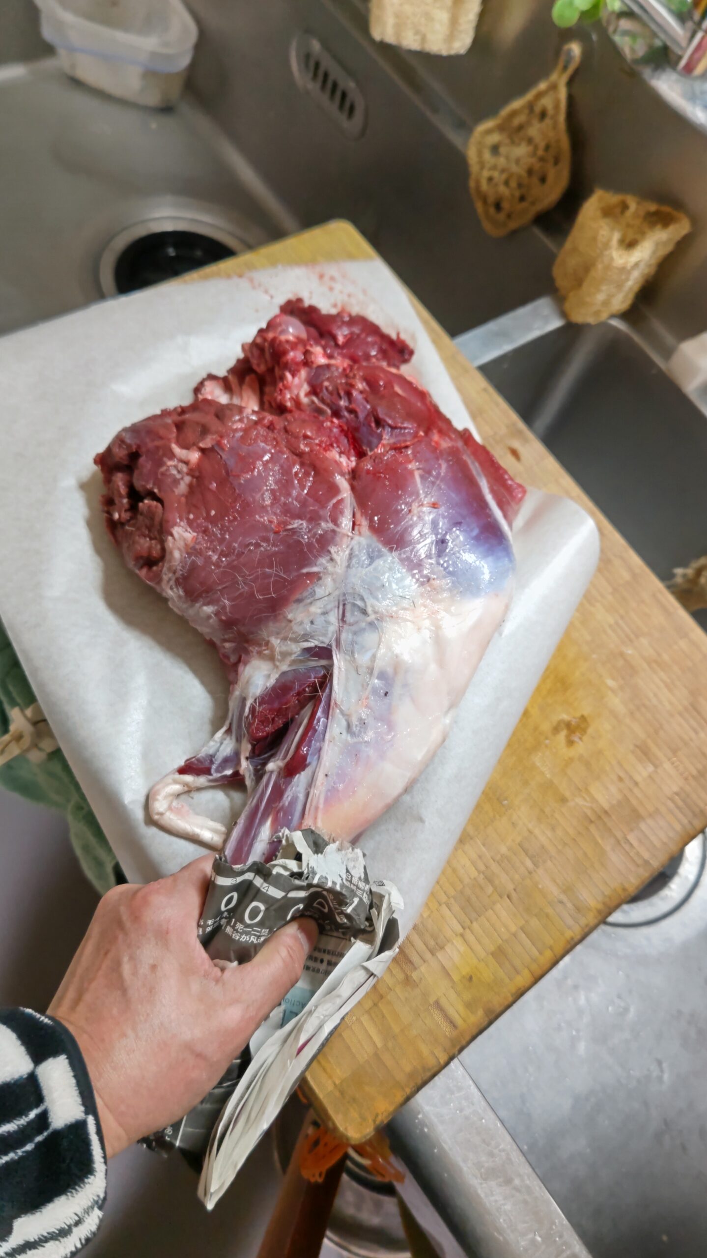 仕留めて解体する前に電話連絡があり「鹿のもも肉の原木で良い?骨付きも持っていける」というので、「骨付きで欲しい」と返事した。