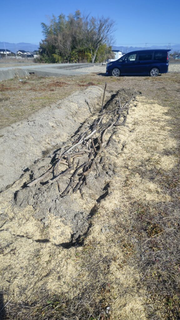 畝になる箇所の土を一度耕して、柔らかくして籾殻を混ぜてから木の枝を全体に敷いて土を被せていく。