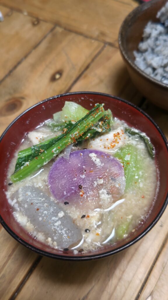 収穫した野菜、養鶏の卵で酒粕入りの味噌汁を作った。