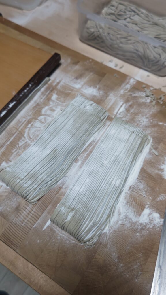 蕎麦を打ち、竹の器に入れてみた