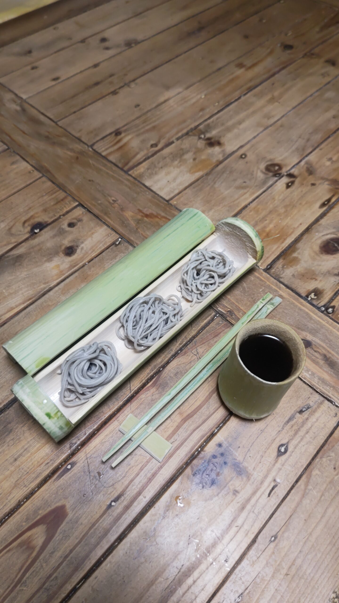最近は竹で箸、コップなどを作っているが、竹を器にして何か出来ないかなぁと思った時、蕎麦を入れてみたくなった。