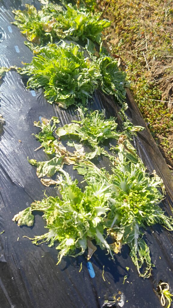 戻って下側の畑を見てみたら、なんと白菜や小松菜などが食べられている。