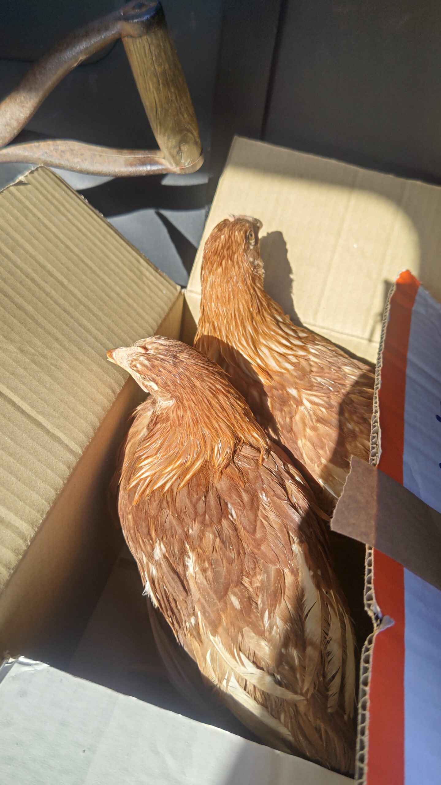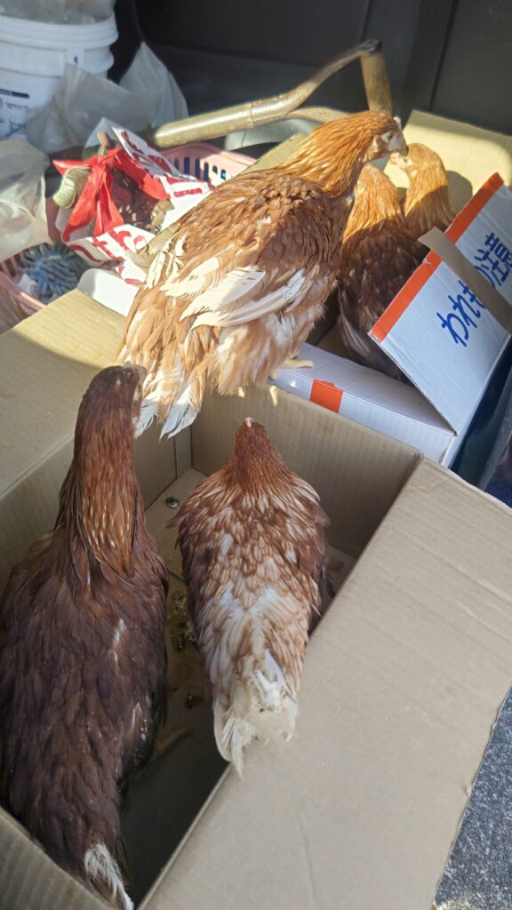 鶏は段ボールに入れて連れ帰ってきた。