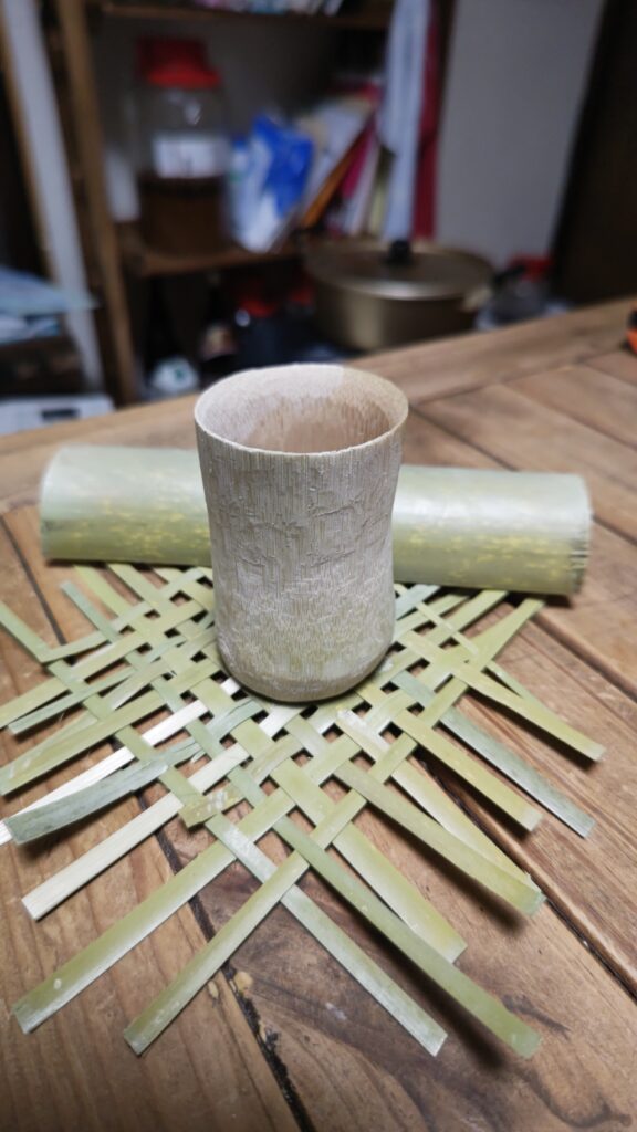 とりあえず編んだ竹に竹のコップを置いてみたら、なんだかいい感じになった。