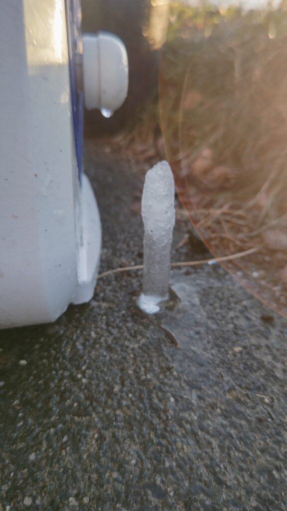 数日前に外の水道からポタポタと水が出ていたようで、道路から氷柱が出ていた。