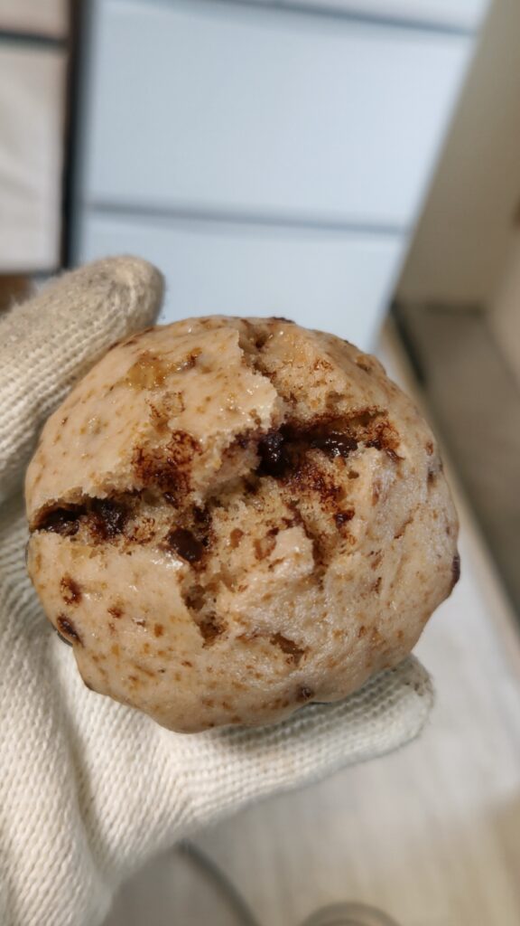 チョコがまんべんなく入っていて、黒いツブツブはくるみ、さらに細かいツブツブはどんぐり。