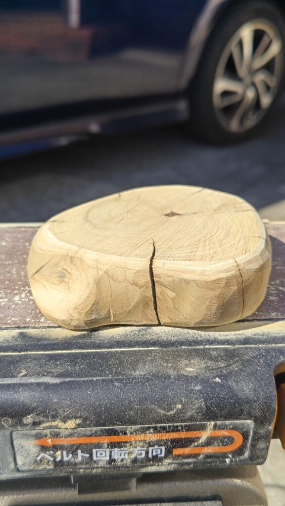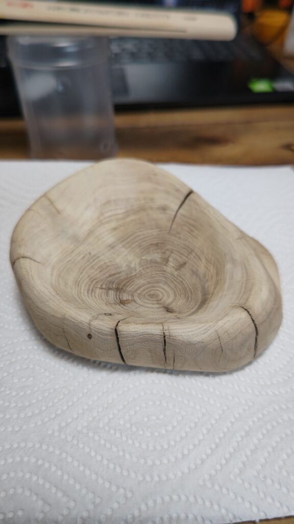 予想を上回るようないい感じの削れ方、このまま漆風の塗料を塗るにはなんだかつまらないし、市販されている木の器的な感じで自分の作品にはならない気がした。