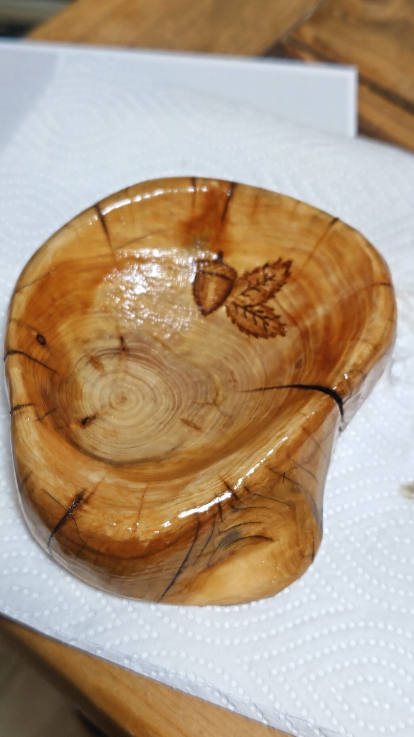 そして、どんぐりのウッドーバーニングのワンポイントアートで、とってもすばらしい癒やされる木の器になった。