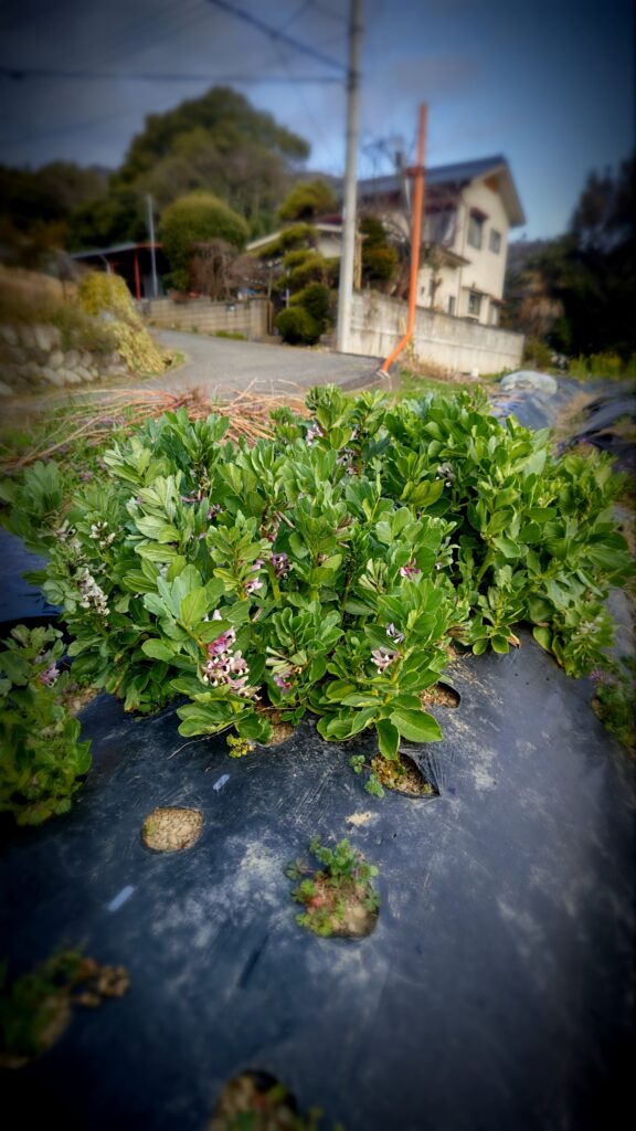 そら豆が冬は霜にやられて枯れていたけれど、暖かくなってから急激に成長してきて立派になり、花も咲き始めてきた。
