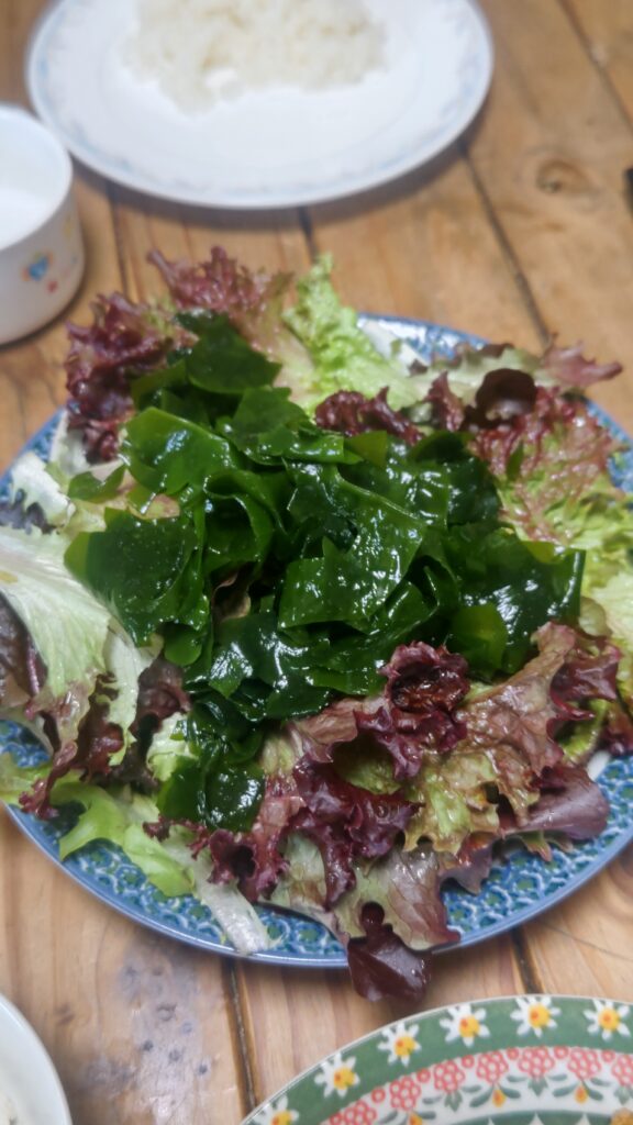 帰宅してから、わかめと、畑で採ってきたサニーレタス、ドレッシングはごま油と塩で作り食べた。