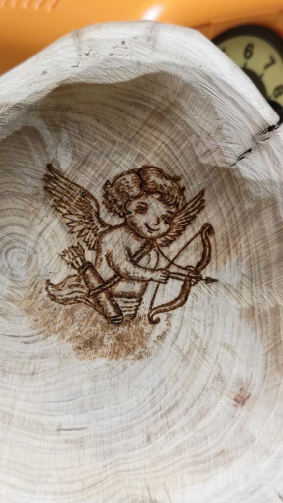 木の器作り、今度は天使のアートを描いてみた。 ハート型に見える形、天使のアートを描くと似合いそうと思った。 細かい部分が上手に描けず、満足な絵ではないけれど、一応天使のアートを描けた。 無垢の木にアートを描くのは、上手く焼けないこともあり、... -