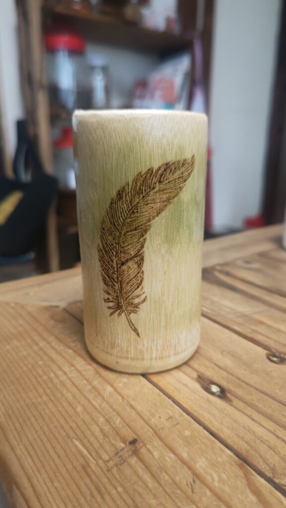竹を使ってコップ作り、作ったコップにウッドバーニングでワンポイントアートを描く。このような竹のコップを作って、カフェがオープンしたら販売する予定で、練習も兼ねて作成している。 竹のコップは電動サンダーで削る、最初の頃はまっすぐ削っていたけ... -