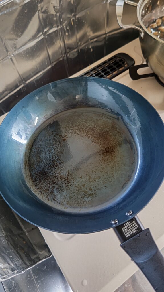 購入して2周間目の鉄のフライパン、少し焦げがあるけれどサビもせず、こびり付きも少ない。