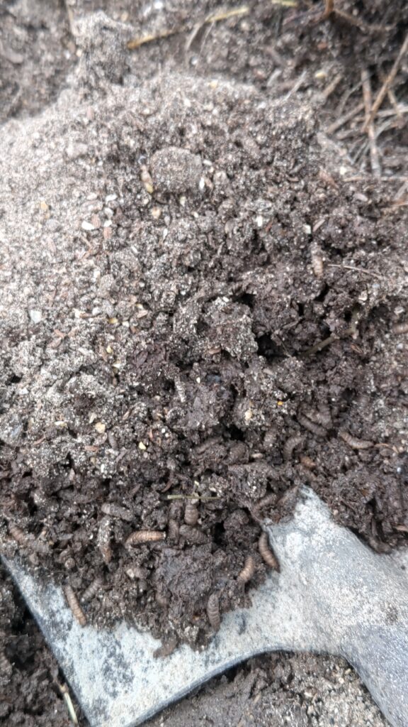 鶏糞を捨ててそのままにしておくと、沢山のハエが寄ってきていたので、土の中に沢山の卵を産み付けたのだろう。