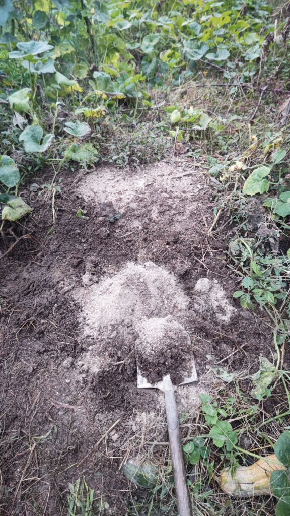 鶏小屋の前に鶏糞を毎日捨てている場所があり、この土がすごくいい感じになっていて、サラサラの土になっている。