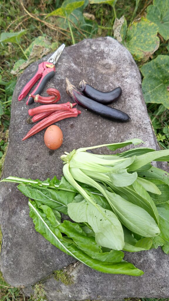 チンゲン菜、からし菜、オクラ、ナス、沢山の恵みと、新鮮な野菜が毎日食べられるのだから、大地への感謝だね。