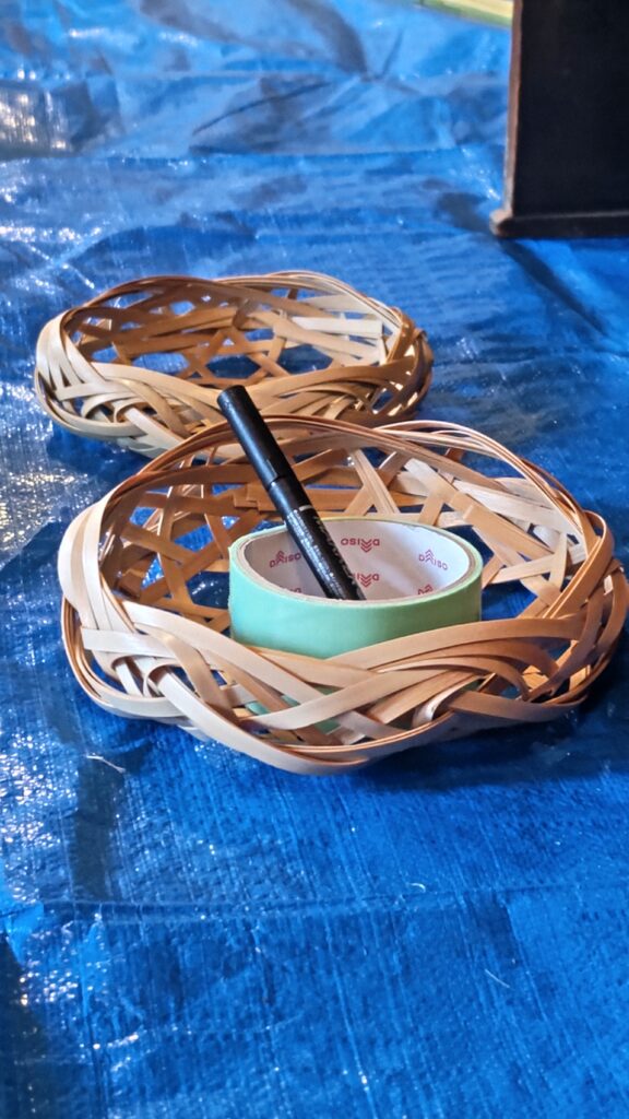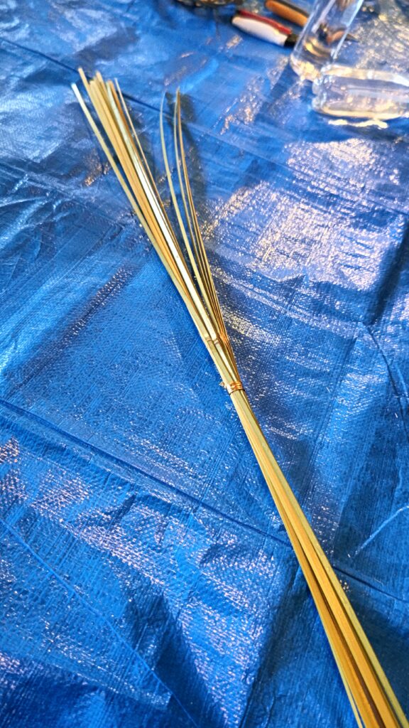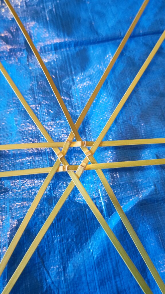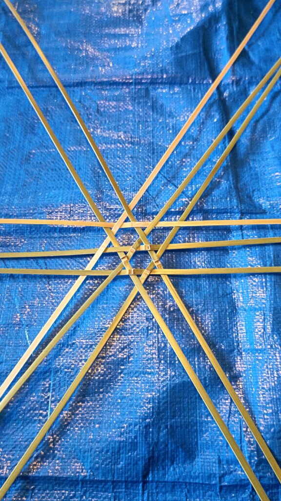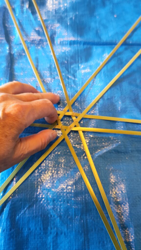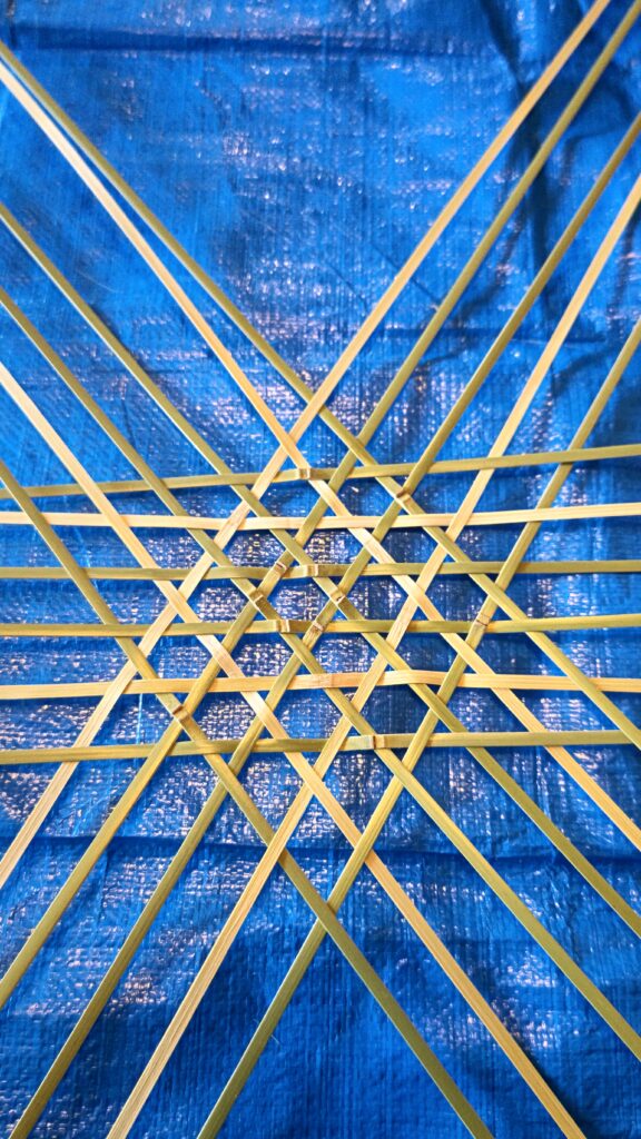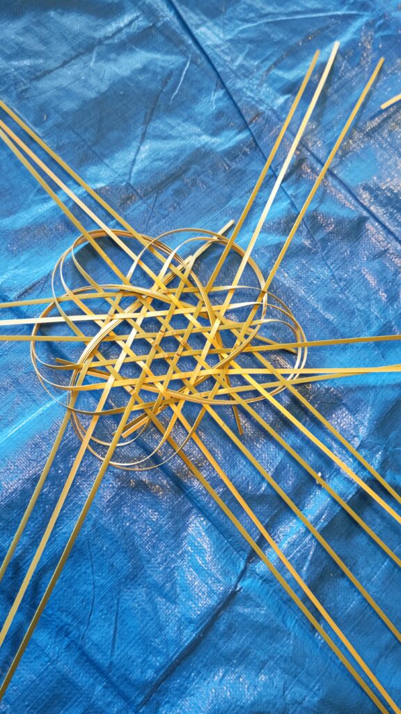 あらかじめ作られていた竹ひご12本、これを使用して籠作りを行う。